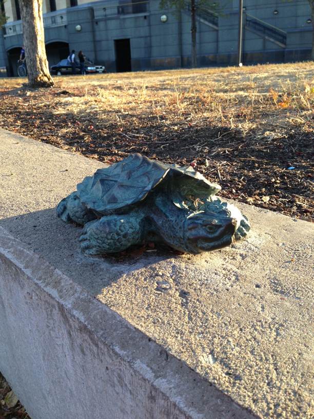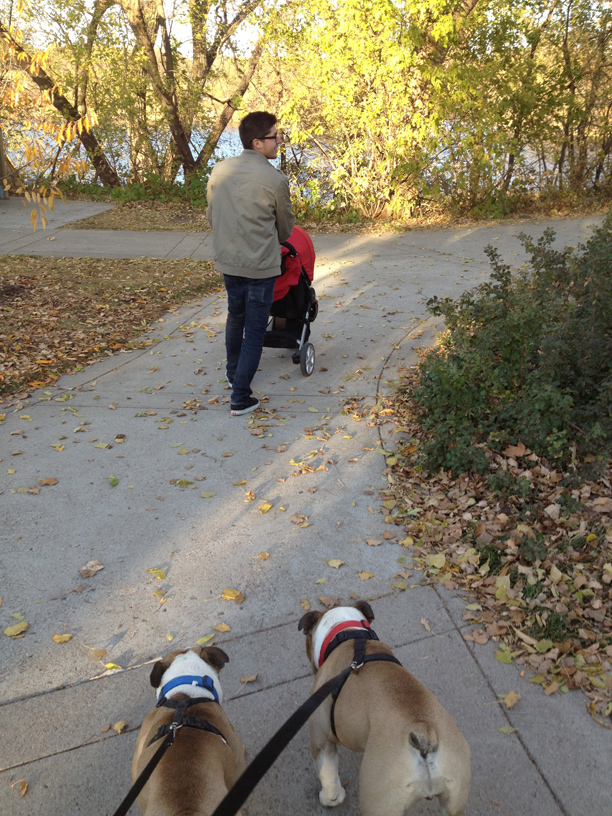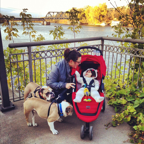 10/14/2012 Sunday before Tommy started work we decided to explore the city as a family and there is no better way to explore than to take to the city by foot. We bundled up Zoë, strapped the dogs up (I really want to get them jackets, but Tommy thinks that makes them look sissy), and set the crock pot to warm (buffalo chicken—YUM). Once every one was ready we headed towards the Mississippi. We found GRASS a pretty hot commodity in the city. The boys enjoyed the grass and took full advantage of it. Also to our surprise we found a park just three blocks away from our apartment.