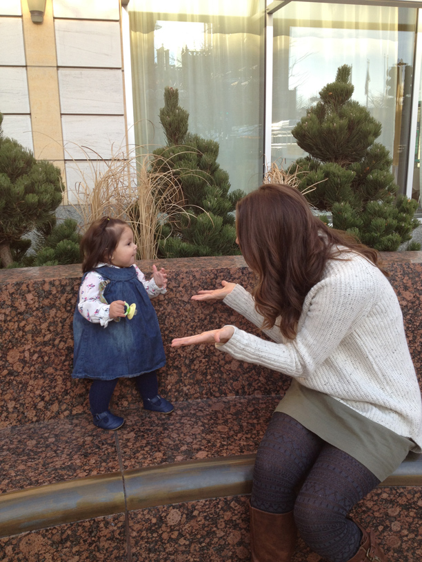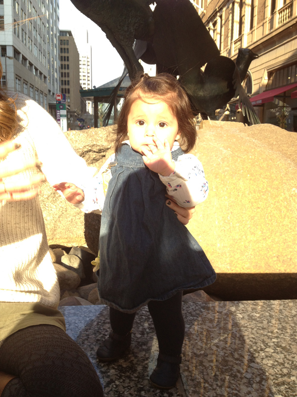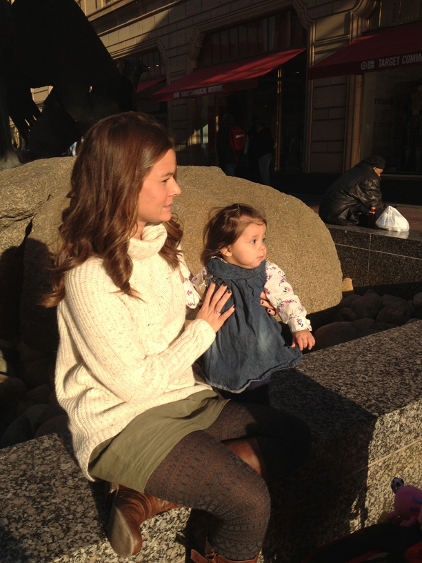 Zoë enjoyed the music. She was dancing and clapping her hands. The girl had a beautiful voice. It will be interesting to see how she does on the show. After we were done signing our consent forms (I signed my first permission slip for Zoë) we continued on our adventure. We found a place in front of Target’s many offices to take a few pictures. The city is already decorated for Christmas season.