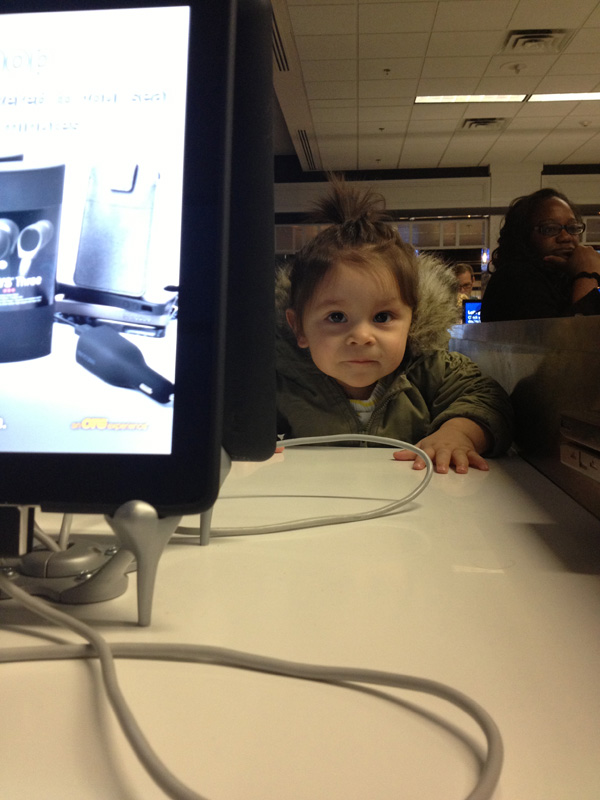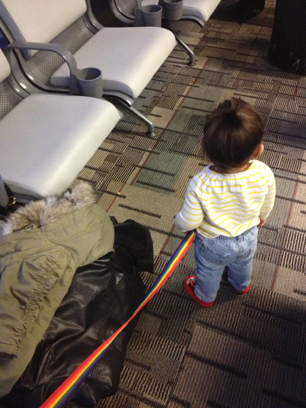 4/12/2013 We FINALLY made it to the airport after our original flight had been canceled due to ANOTHER WINTER STORM. After it was all said and done we got about 12-15 inches of snow. I never thought that we would run into this problem in the middle of April, but it happened. The great thing I love about Minnesota and the snow is that they never let it get them down. Right when the snow starts falling there are trucks out dropping ice and streets and freeways are being plowed. So thankfully we were able to reschedule our flight for Friday morning bright and early. The roads were clear enough for us to drive to the airport. Once we got to the airport we realized everyone else rescheduled their flights for today too. It was very crowded with long lines. I was able to check in and drop off Zoe’s car seat. Then we jumped into the ever increasing security line. Lucky for me when I travel solo with a baby people take pity on me. The security lady decided to bump me up to the front of the security line. Once we got through security we were able to grab a quick breakfast and find our gate with plenty of time to spare. To our surprise Delta has embraced technology and set up tablets EVERYWHERE. Zoe and I enjoyed a morning chat at one of the stations. I love how happy she was to be up and going at 5:30 in the morning. Oh and we were able to try out Zoe’s new “leash”. (We have decided to go with the “leash” option because Zoe does not like holding our hands {she’s an independent women and we respect that}, I can’t imagine anyone likes holding their arm over the head for any length of time, and Zoe’s safety is just as important as her independence)