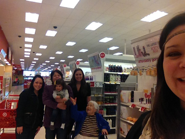 After Hibachi we ran across the street (literally Maddee and I pushed Grams in her wheelchair across a major intersection) to Target. It has been a long time since I have been to Target with my family. It is always an adventure. We forgot to get a group picture at Hibachi so I decided to capture our groups antics at Target.