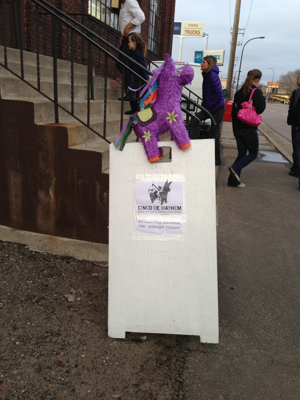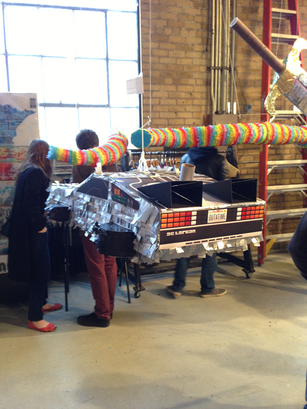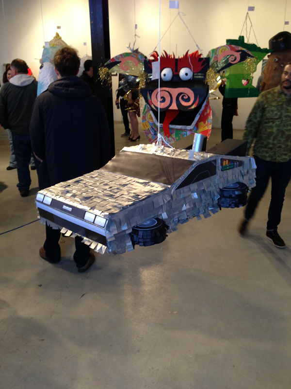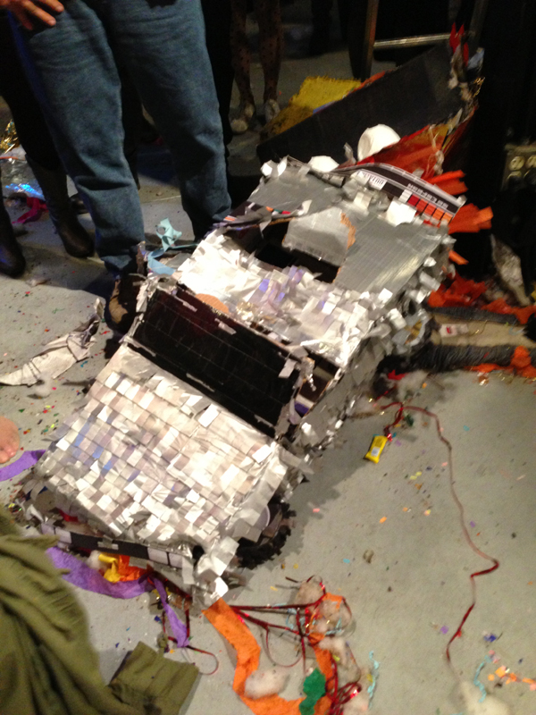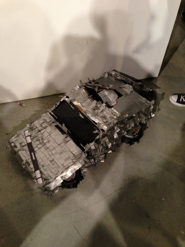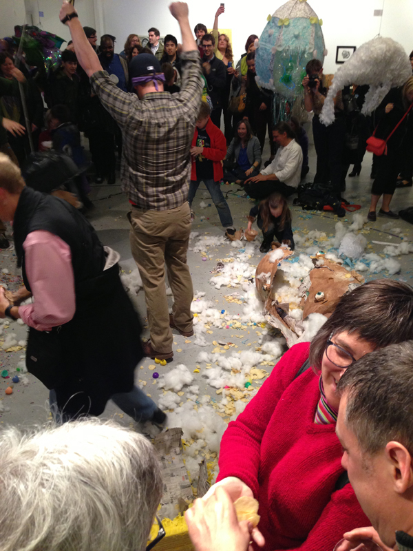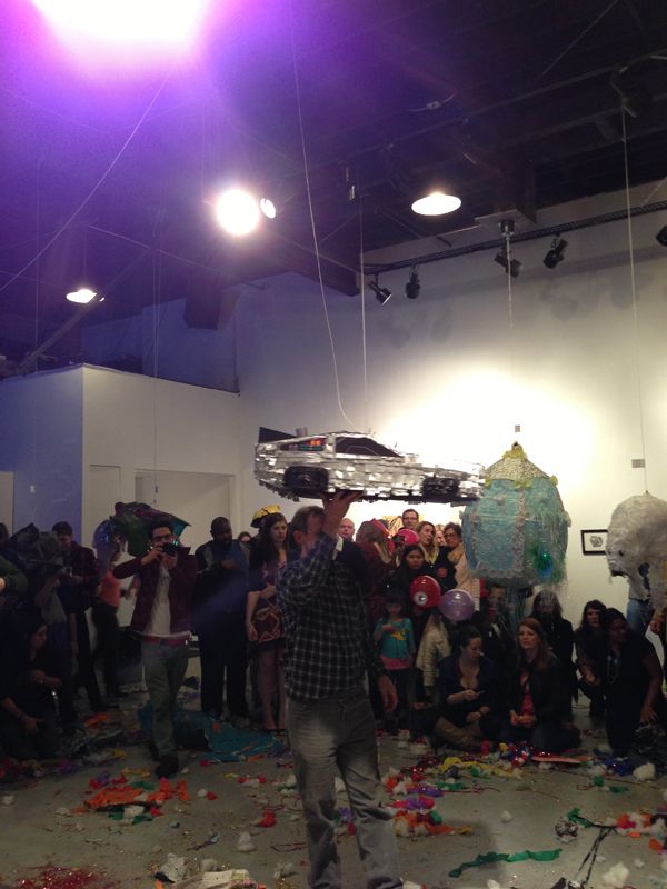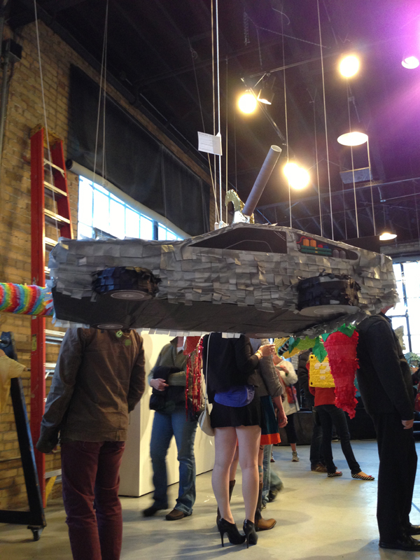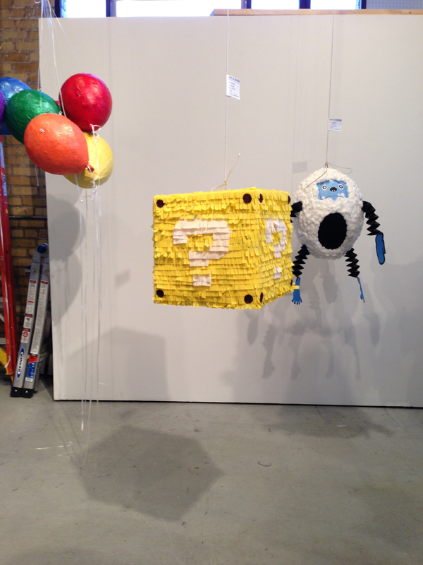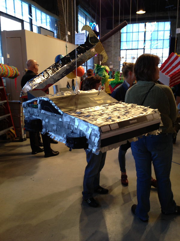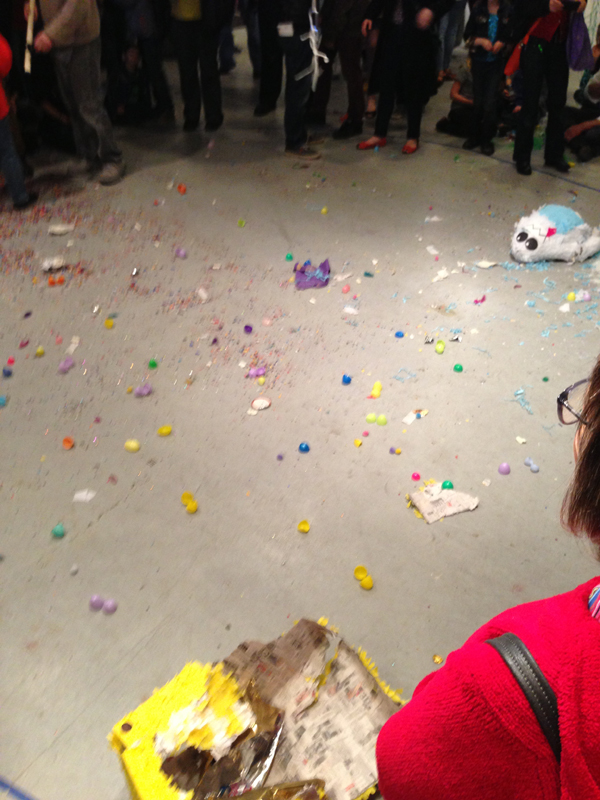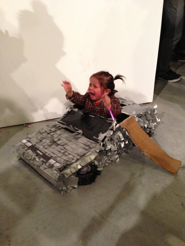 Tommy participated in a pinata exhibition. Participates paid a dollar for 30 seconds to hit a pinata. There were several creative pinatas and it was very exciting to see what they were filled with.