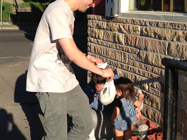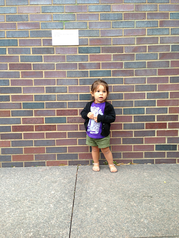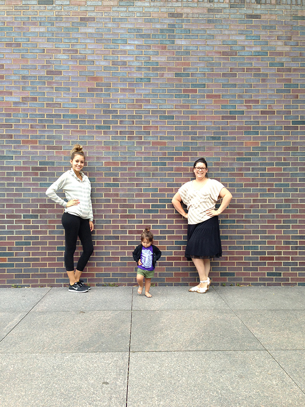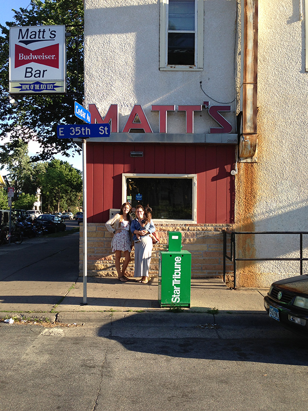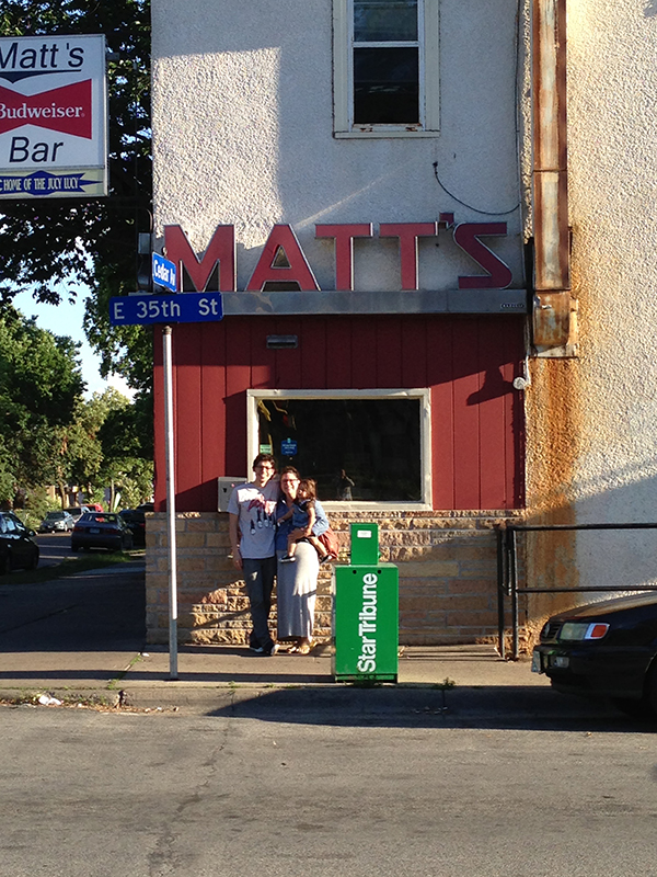 Now I have a funny story… It was Sami’s last dinner and we had been talking up the Jucy Lucy from Matt’s Bar. After we all enjoyed our delicious cheesy lava burgers we noticed Zoe had a code brown. Since we were in a bar I knew there wasn’t going to be a changing table, we paid the bill and decided to change her diaper in the car. Before we left we wanted to grab a quick picture in front of the bar (it was one of our favorite places and I wanted to have a picture to remember it by). The girls took their picture first and up next was our family picture. I was holding Zoe on the outside and then decided to give her to Tommy to bring her to the middle. While moving Zoe from one arm to the other he noticed there was something brown on his arm, so he handed her back to me. After further investigation it turned out to be POOP… wait for it. I lifted up Zoe’s skirt to see which side it was exploding out of and all I see is BUNS! (not sure how I didn’t get poop on me, but I was happier cleaning it then getting it on me) Tommy goes searching for the missing diaper… it turns up on the street corner, (looks like Zoe has a pretty good arm.) We took care of business right then and there. Sami was nice enough to capture the moment from across the street.
