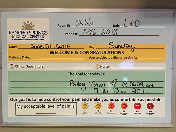 Grey was due June 17th, but of course that day came and went. I had been walking all throughout my pregnancy due to gestational diabetes. Lucky for me that also meant I got to see Grey’s handsome face monthly and then almost weekly up until the end of my pregnancy. But let’s be honest I wanted him to be Earth side sooner rather than later, he had other plans. I went for my last appointment on Friday June 19th. The doctor checked and I was 3cm dilated. My doctor said if I don’t have him by Father’s Day she wanted to induce me so we scheduled my induction for Monday June 22nd. Also the night before my appointment my sister had gone into labor, so I left the doctors office and headed down to San Diego to wait for the arrival of my niece, Avery. Congratulations Ashley and Brady!!